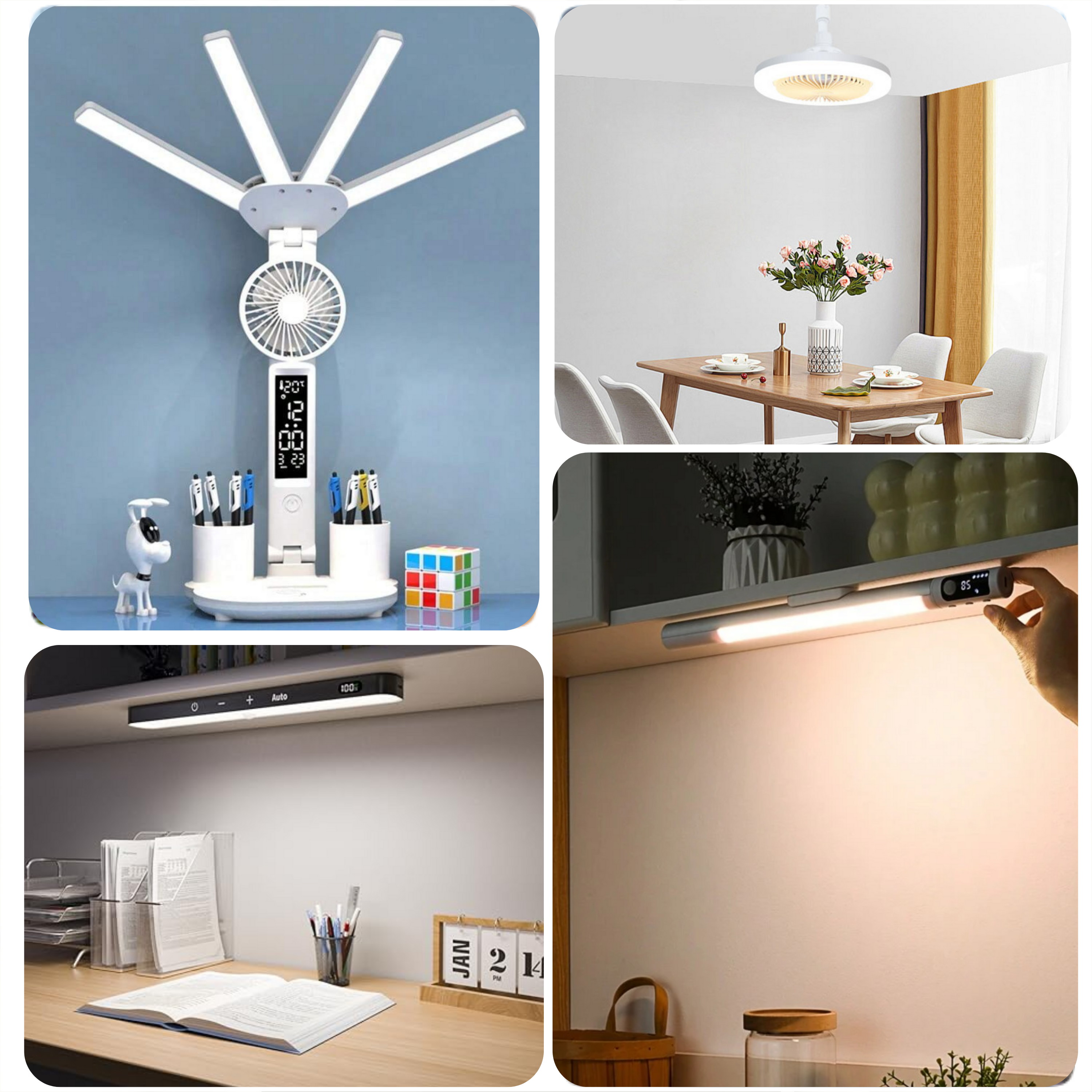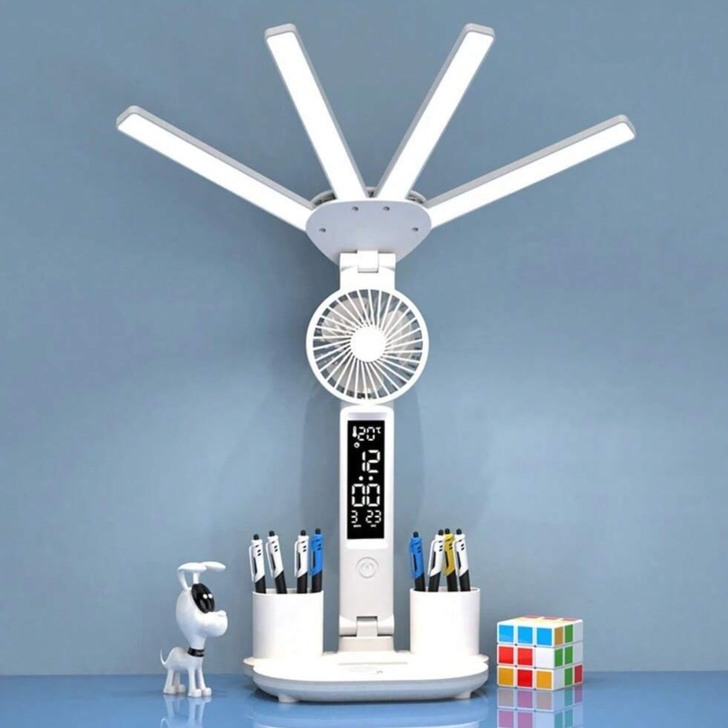 Transform your workspace with the Intelligent 3-in-1 Multifunction LED Desk Lamp—a perfect blend of innovation, convenience, and style. With a foldable four-headed design, built-in fan, and intelligent LED display, this lamp doesn’t just light up your desk—it elevates your productivity and comfort.